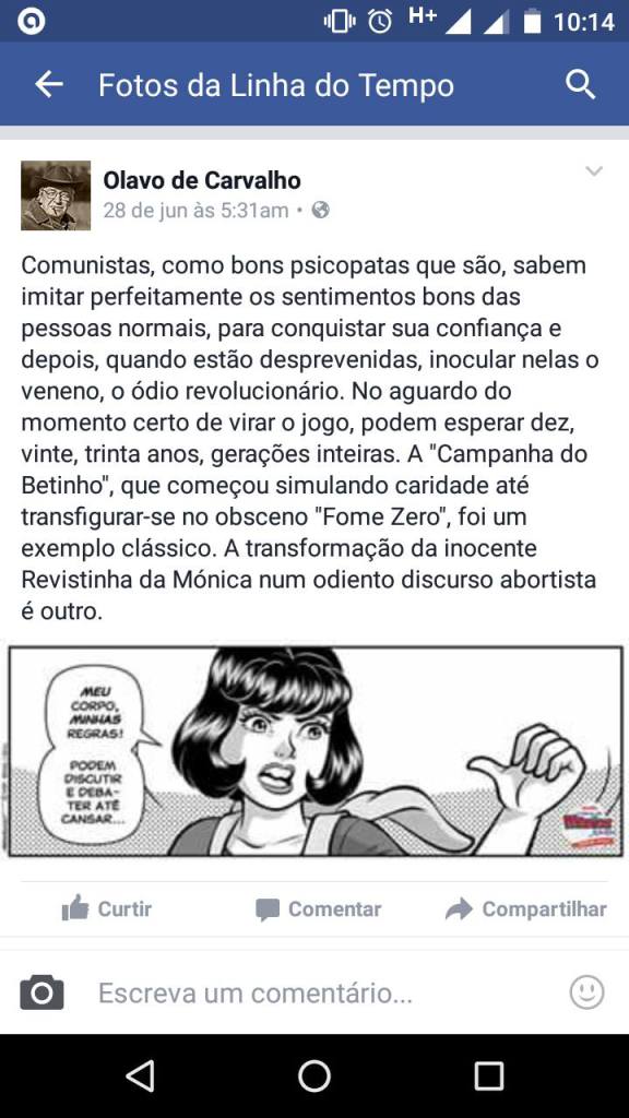 Eis que chega o guru da direita, o filósofo (porque para ser filósofo não basta muito) Olavo de Carvalho, e distorce uma história em quadrinhos, tratando-a como apologia ao aborto, simplesmente porque Mônica usou a expressão feminista “meu corpo, minhas regras”. Claro, na cabeça do mentor intelectual de Bolsonaro, faz tudo parte de uma conspiração comunista para gerar lavagem cerebral em criancinhas.