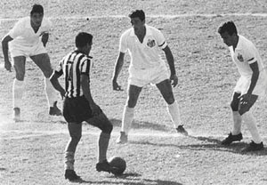 Contra o Fiorentina, o “seu” Manuel tinha feito coisa parecida. Pegara uma bola, invadira a área. E lá veio para cima dele um beque. Claro que Garrincha o driblou. Então o quíper saiu do gol. Garrincha passa por ele. Mas tem outro beque à espera de Garrincha dentro do gol. Que faz Garrincha? Dá um drible no tal beque, não de quebrar espinha, o que é mais especialidade de Didi, mas de jogá-lo fora do gol, o que ainda não se tinha visto. Porque o tal do beque tinha ido para o gol para ficar lá, para barrar Garrincha. E o drible de Garrincha jogou-o fora do gol. O tal do beque, quando quis voltar para o gol, evidentemente bateu com o nariz na trave.
