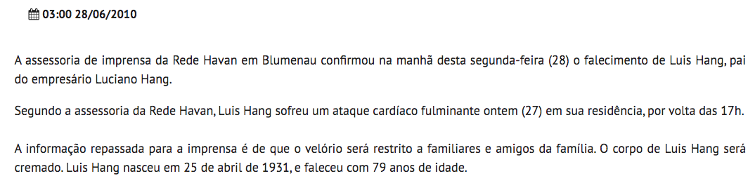 Na tarde do domingo, 27 de junho de 2010, o empresário Luciano Hang recebeu um daqueles golpes capazes de tirar qualquer pessoa do eixo – saiu na varanda de sua confortável mansão no centro de Brusque e encontrou o pai, morto, enforcado, pendurado num caibro, com a língua de fora e os olhos arregalados.