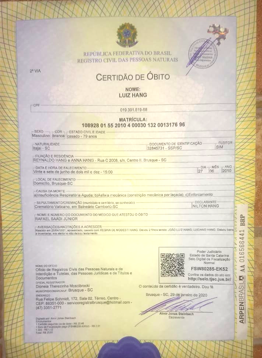 Enfim, saiu da delegacia espalhando a fake news do infarte, mas com um atestado verdadeiro. Em seguida, ordenou ao agente funerário a cremação imediata do corpo, levado na mesma noite ao Crematório Vaticano, em Balneário Camboriú, a 30 km.