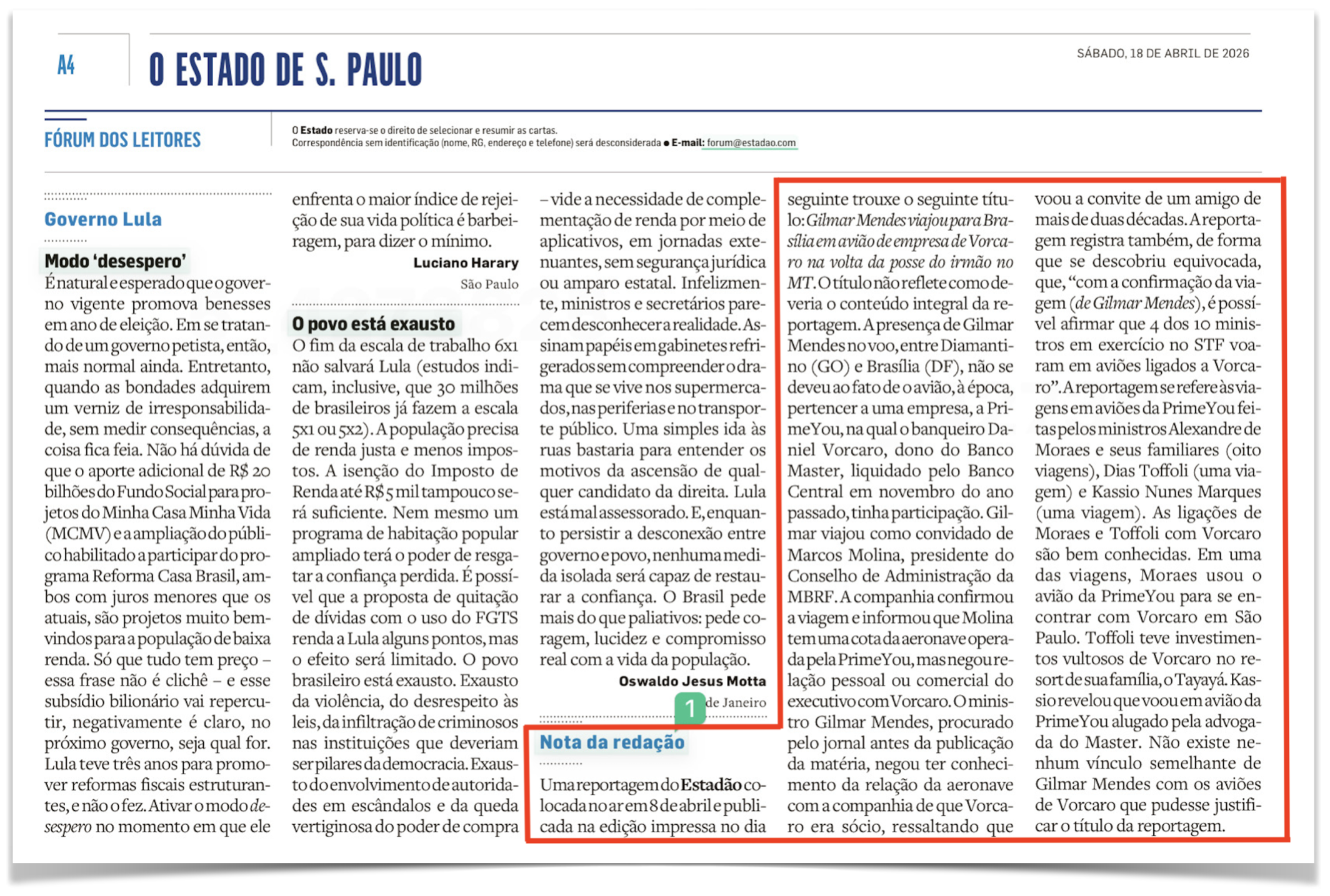 O Estadão teve que corrigir e pedir desculpas por uma notícia em que vinculava o ministro Gilmar Mendes a Gabriel Vorcaro, com esse título: