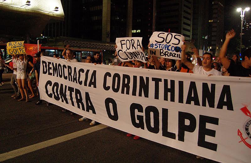 Como já tem se percebido há algum tempo nas manifestações anti-golpe, uma expressiva presença de manifestantes trajando a camisa retrô do Corinthians. A número oito, de Sócrates, com maior frequência. Ontem não eram simples coadjuvantes. Protagonizaram o ato, portando a maior faixa do protesto.
