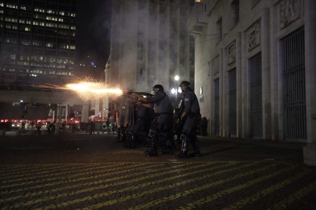 O Choque então apareceu com lanternas procurando manifestantes na rua. Um amigo meu, fotógrafo freelancer, voltou até o Teatro Municipal para ver como ficou o local após o protesto. Foi recebido com bombas, sendo que tinha acabado de tirar o seu capacete com os dizeres de imprensa para se proteger.
