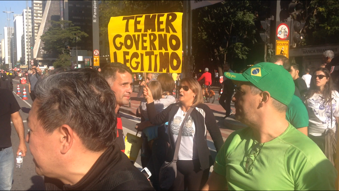 O Nas Ruas, como seus similares MBL, Vem Pra Rua e Revoltados Online, saiu do armário para apoiar o interino. A bandeira da luta contra a corrupção foi esquecida. Uma senhora exaltada segurava um cartaz escrito “Temer governo legítimo”.