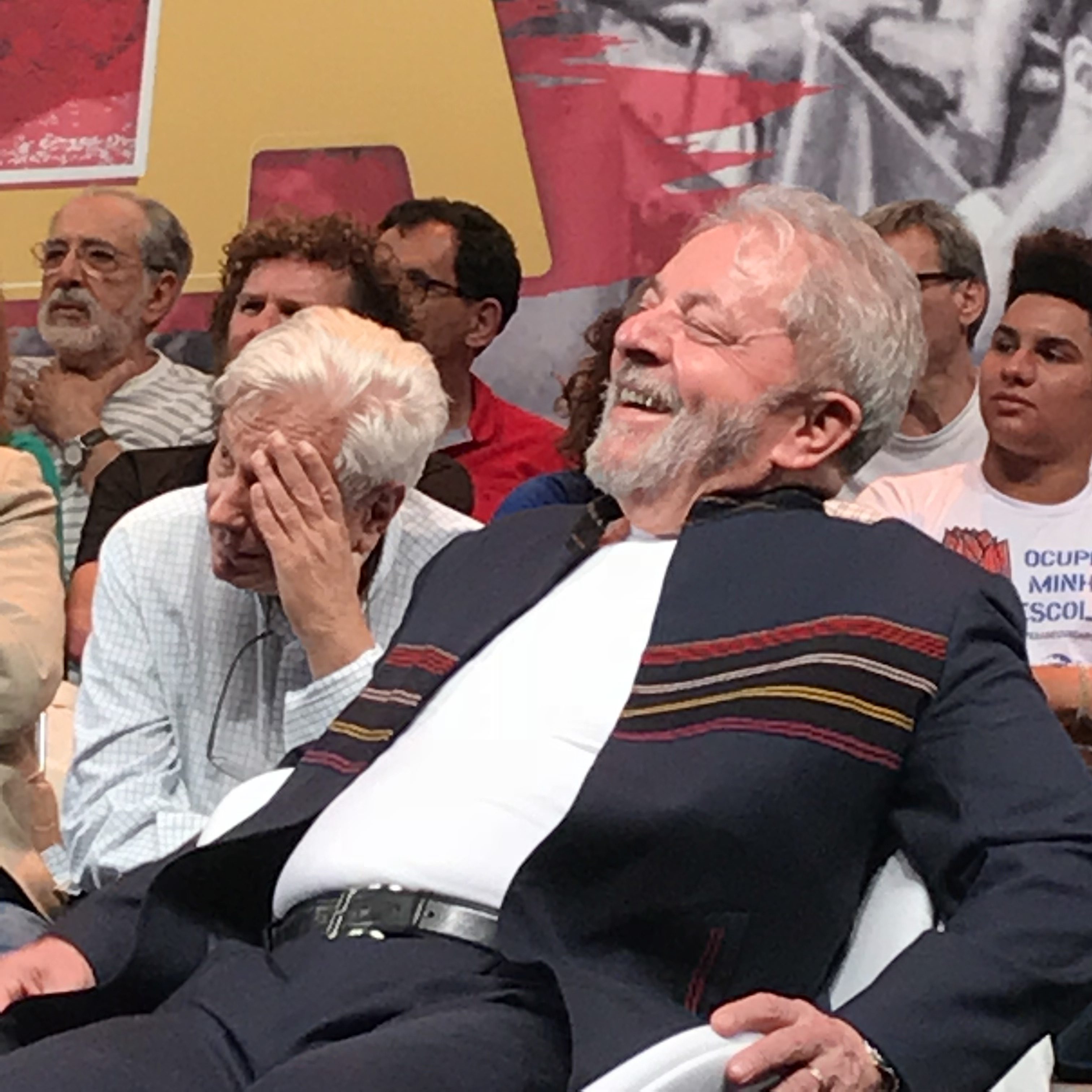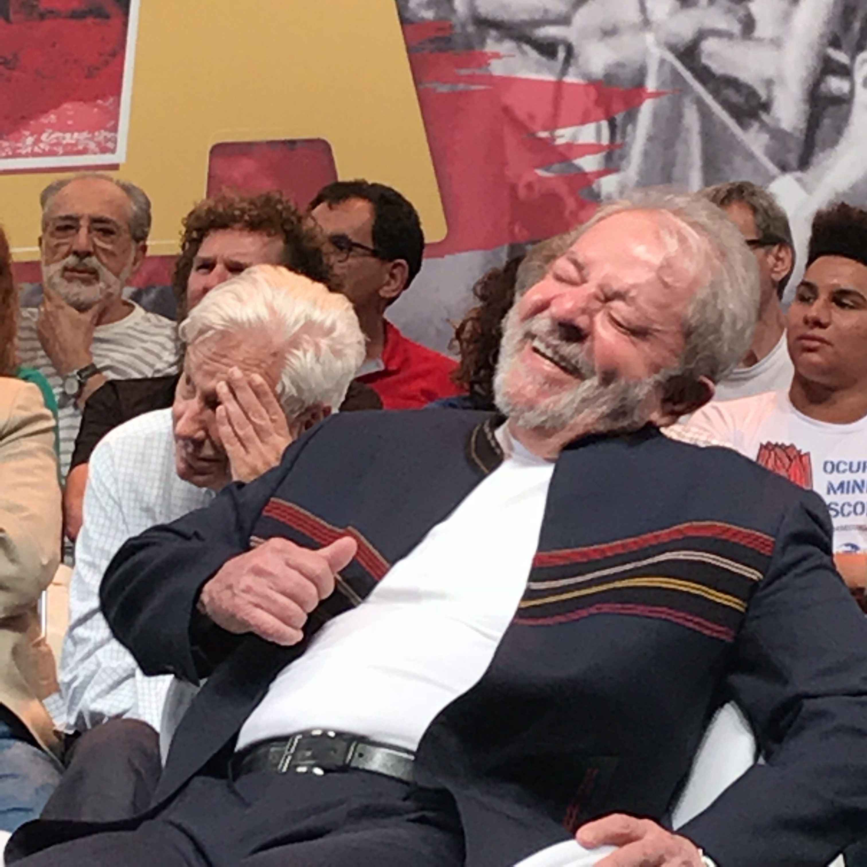 Uma outra fotógrafa, Louise Botkay, fez o registro da cena de ângulo diverso — e, nele, Lula aparece rindo, bem como alguns dos convidados no palco. A jaqueta foi presente de Evo Morales, presidente da Bolívia.