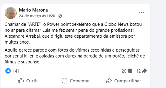 “Chamar de “ARTE” o power point xexelento que a Globo News botou no ar para difamar Lula me fez lembrar do grande profissional Alexandre Arrabal, que dirigiu este departamento da emissora por muitos anos. Aquilo parece parede com fotos de vítimas escolhidas e perseguidas por serial killer e coladas com durex na parede de um porão, clichê de filmes e suspense”.