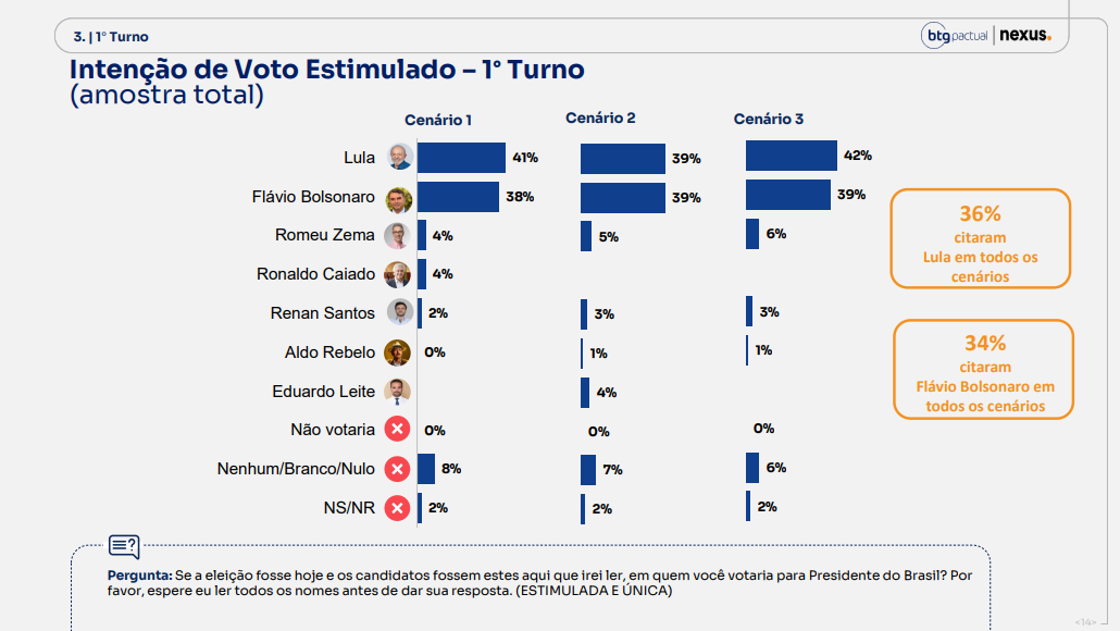 O empate cravado entre Lula e Flávio Bolsonaro no 2° turno, segundo pesquisa BTG/Nexus