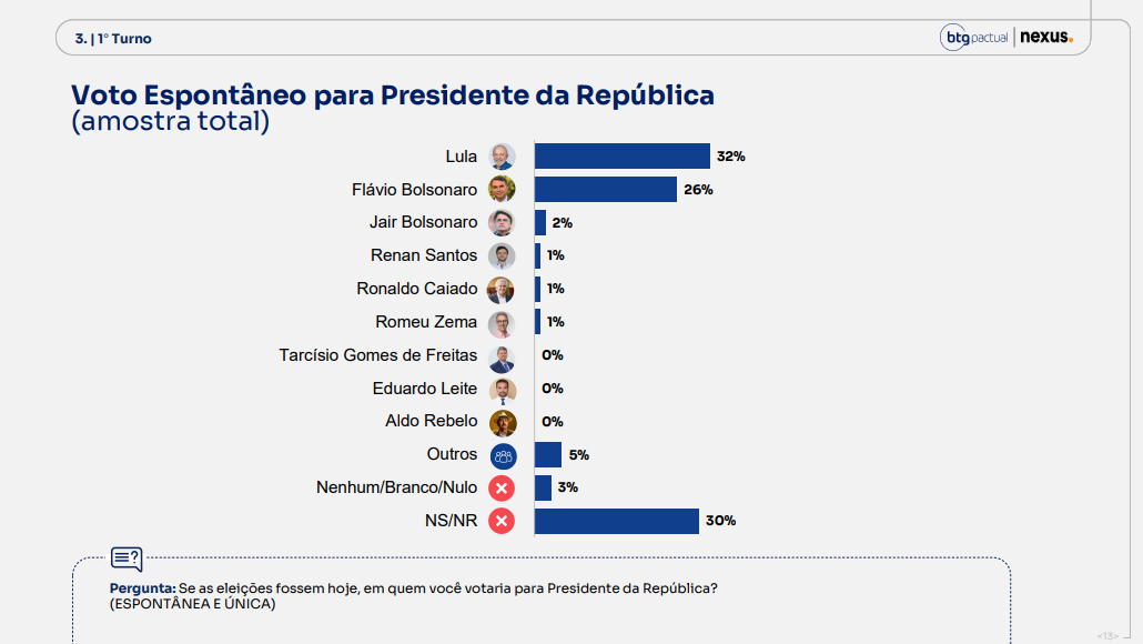 No voto espontâneo, Lula lidera com 32%, seguido por Flávio Bolsonaro, com 26%. Jair Bolsonaro, que está inelegível e em prisão domiciliar, foi citado por 2%, enquanto outros nomes aparecem com percentuais menores.
