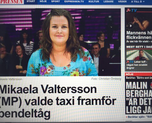 Ao cruzar a fronteira da imprudência, a deputada Mikaela Valtersson (Partido Verde, Miljöpartiet) virou notícia em vários jornais: Mikaela cometeu o desatino de gastar o dinheiro do contribuinte pegando táxi. Segundo o jornal Expressen, a investigação das despesas da deputada mostrou que em 2011 ela pegou táxi 43 vezes durante um período de seis meses, ”a um custo de 17 mil coroas (cerca de 2,6 mil dólares) do dinheiro do contribuinte, apesar de morar perto de uma estação de trem”.