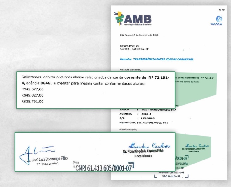 A já famosa conta da AMB, cujos cheques eram assinados pelos Drs. Florentino (presidente) e Bonamigo (tesoureiro), registram transações entre a conta de número 2-151-4, da agência 0646, do Banco Itaú, na Avenida Paulista, e a número 115.688-8, da agência 4223-4 do Banco do Brasil. As duas tem os mesmo CNPJ, o 61.413.605/0001-07, o da AMB.