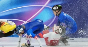 A patinadora polonesa Kamila Seillier foi atingida no rosto pela lâmina da rival Kristen Santos-Griswold (EUA) durante as quartas de final dos 1.500 metros...