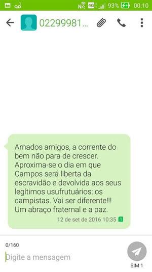 “Amados amigos, a corrente do bem não para de crescer. Aproxima-se o dia em que Campos será libertada da escravidão e devolvida e devolvida aos seus legítimos usufrutuários: os campistas. Vai ser diferente!!!”