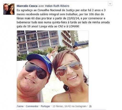 O juiz federal paranaense Marcelo Antonio Cesca, 33 anos, está tendo seus 15 minutos de fama depois que uma foto sua na praia, com uma namorada bem mais nova, virou notícia. Junto às imagens, ele escreveu no Facebook: “Eu agradeço ao Conselho Nacional de Justiça por estar há 2 anos e 3 meses recebendo salário integral sem trabalhar, por ter 106 dias de férias, mais 60 dias pra tirar a partir de 23/03/14, e por comemorar e bebemorar tudo isso numa quinta-feira”.