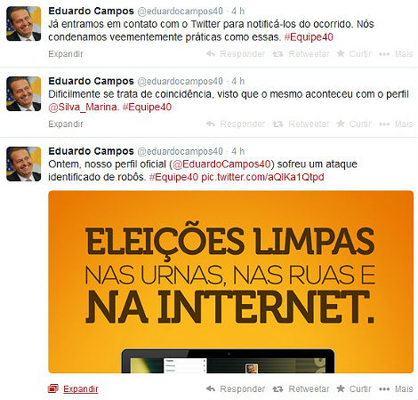A acusação gerou uma resposta da equipe de Campos, afirmando que sua conta oficial sofreu, na verdade, um ataque. “Condenamos veementemente práticas como essas e o uso político de perfis fakes. As redes sociais, hoje, são um dos maiores palcos de debate sobre o Brasil e sobre o futuro do país. Nós defendemos uma campanha limpa, tanto nas ruas como na internet. Quanto mais o debate sobre o novo Brasil se anuncia, mais os membros da velha política se assustam e tentam impedi-lo, também na internet. Mas este debate é inevitável.”