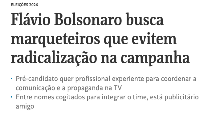 O jornal foi ouvir fabricantes de imagens, para produzir essa mensagem de assessoria de imprensa: “Flávio Bolsonaro busca marqueteiros que evitem radicalização na campanha”.