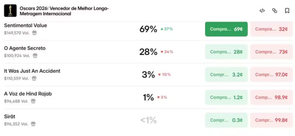 Na categoria de melhor filme internacional, considerada uma das principais apostas para o Brasil, O Agente Secreto, de Kleber Mendonça Filho, aparece entre os mais cotados, mas não lidera as projeções. Segundo a plataforma de apostas Polymarket, o longa brasileiro tem cerca de 29% de probabilidade de vitória na categoria.