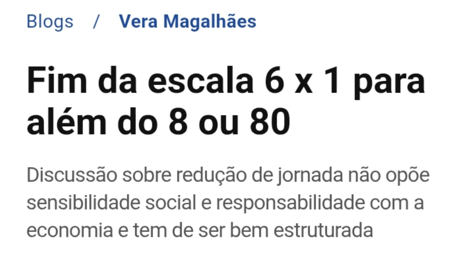 Os jornalões têm dado manchetes alarmistas para a possibilidade de fim da escala 6X1 na jornada de trabalho. Este é o título da coluna de Vera Magalhães na capa do Globo: