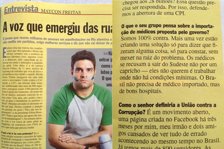 Tantos jovens brilhantes emergindo nos protestos, e eis que a Veja consegue escolher, para dar nas suas Páginas Amarelas, um certo Maycon Freitas que tem sido, justificadamente, chamado de ‘débil mental’ nas mídias sociais.