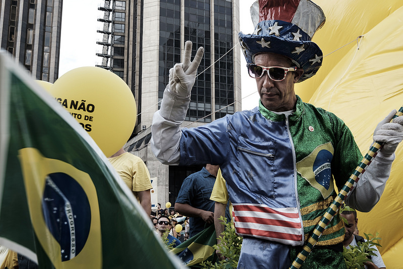 O que passa pela cabeça de um cidadão que veste uma jaqueta metade Brasil, metade Estados Unidos, e põe sobre a cabeça uma cartola que retrata a bandeira dos Estados Unidos?