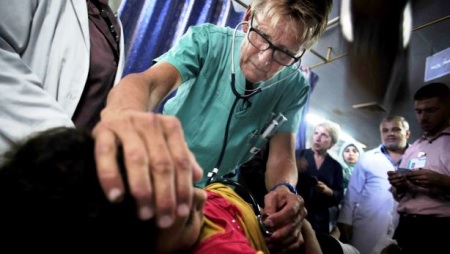 O médico norueguês Mads Gilbert, 67 anos, é um foco tocante, inspirador, soberbo de luz no cenário desolador de Gaza.