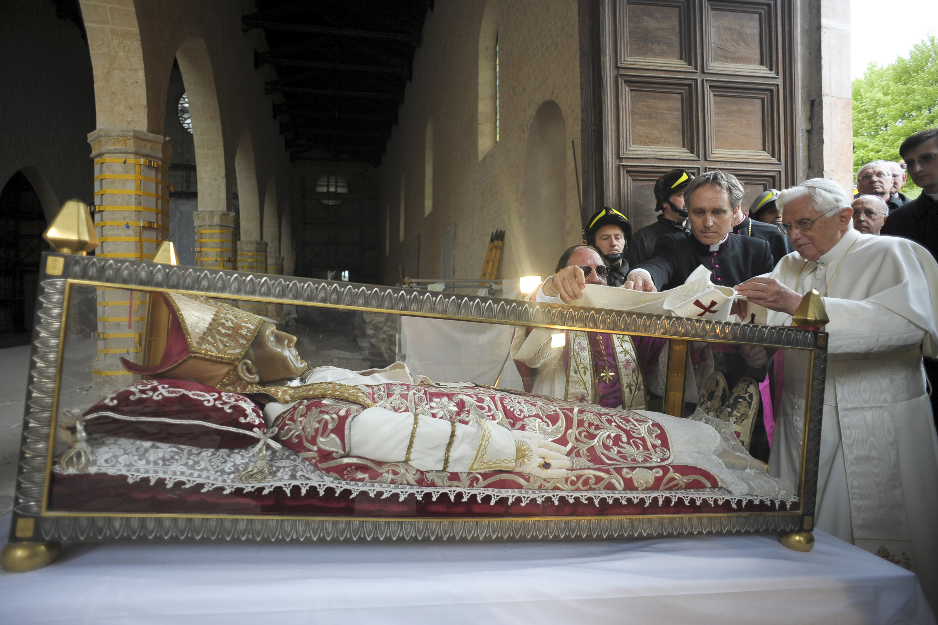 E há mais uma razão pela qual acho que essa história interessaria os leitores atuais. O papa Bento XVI, recentemente, homenageou a memória e o legado do papa ermitão do passado medieval do catolicismo. Em abril de 2009, quando visitou o túmulo de Celestino, ele fez mais do que rezar diante dos restos mortais. Sem explicação, o papa passou vários minutos lá – removeu o pálio que estava em seus ombros e o pousou gentilmente na urna de vidro de Celestino. Pálio é um ornamento religioso em formado de Y que lembra uma rígida e longa echarpe. É um dos principais símbolos da autoridade episcopal do papa. Foi uma grande homenagem a Celestino V.