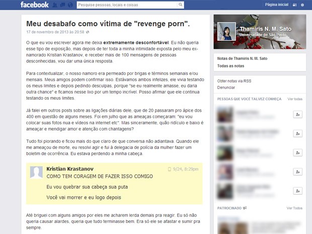 Kristian Krastanov, o búlgaro namorado de Thamiris, tem telhado de vidro. Possuía dezenas de perfis fakes (inclusive um passando-se pela namorada), tinha hackeado o e-mail de Thamiris e enviava-lhe mensagens obsessivamente. “De 20 por dia, passaram pro ápice dos 400 em questão de alguns meses”, disse ela. Alegava ter sido traído e há meses vinha ameaçando-a (Thamiris chegou a fazer um boletim de ocorrência semanas antes). Suas ameaças, como tudo na internet, estão registradas: “Eu vou colocar suas fotos nua e vídeos na internet”. Ninguém, além da vítima, se preocupou. Felizmente, nem todos são omissos.