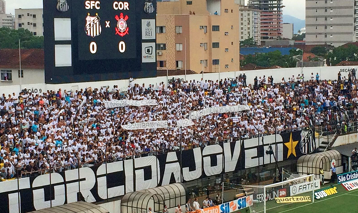 Na tarde de ontem, na Vila Belmiro, torcedores do Santos e do Corinthians exibiram faixas com temas em comum. Na Torcida Jovem do Santos lia-se “O monopólio acabou”, em referência aos direitos de transmissão pela Globo. Pelo lado corintiano, uma faixa estampada: “FPF = Federação de Palhaçada e Falcatrua”.