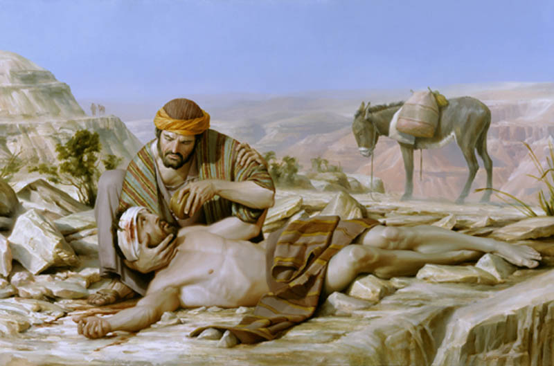 “Um homem descia de Jerusalém para Jericó, quando caiu nas mãos de assaltantes. Estes lhe tiraram as roupas, espancaram-no e se foram, deixando-o quase morto. Aconteceu estar descendo pela mesma estrada um sacerdote. Quando viu o homem, passou pelo outro lado. E assim também um levita; quando chegou ao lugar e o viu, passou pelo outro lado. Mas um samaritano, estando de viagem, chegou onde se encontrava o homem e, quando o viu, teve piedade dele. Aproximou-se, enfaixou-lhe as feridas, derramando nelas vinho e óleo. Depois colocou-o sobre o seu próprio animal, levou-o para uma hospedaria e cuidou dele. No dia seguinte, deu dois denários ao hospedeiro e lhe disse: ‘Cuide dele. Quando eu voltar, pagarei todas as despesas que você tiver’.”