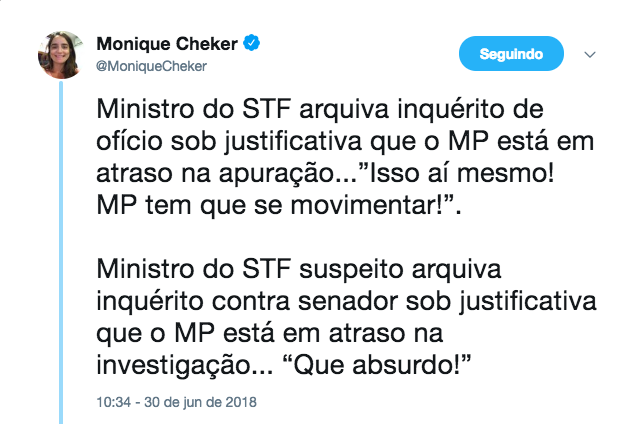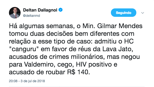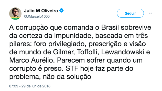 “A corrupção que comanda o Brasil sobrevive da certeza da impunidade, baseada em três pilares: foro privilegiado, prescrição e visão de mundo de Gilmar, Toffolli, Lewandowski e Marco Aurélio”, escreveu no Twitter.