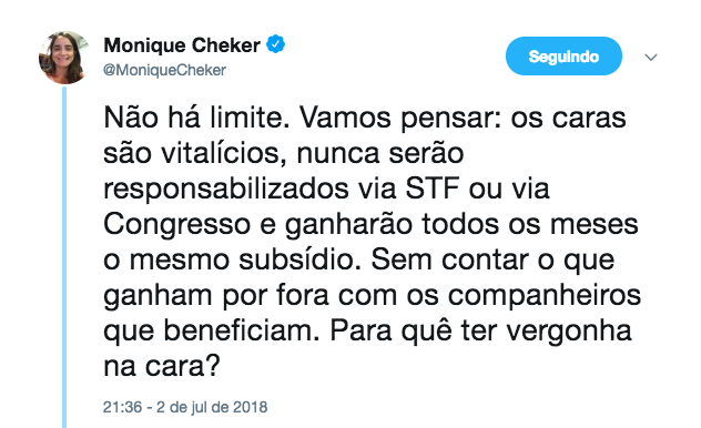 “Não há limite. Vamos pensar: os caras são vitalícios, nunca serão responsabilizados via STF ou via Congresso e ganharão todos os meses o mesmo subsídio. Sem contar o que ganham por fora com os companheiros que beneficiam. Para quê (sic) ter vergonha na cara?”, disse.