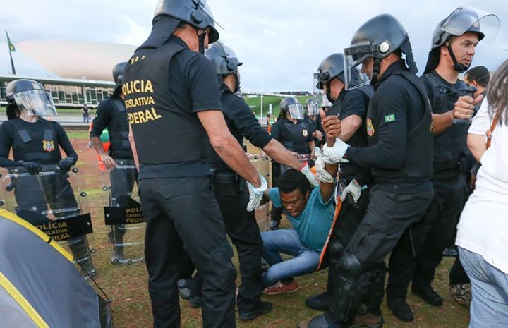 Fernando Holiday, o negro que odeia negros e é uma das lideranças do grupo golpista MBL (Movimento Brasil Livre), foi eternizado em uma foto onde aparece dominado por um grupo de policiais. O flagrante aconteceu durante a desocupação do gramado em frente ao Congresso Nacional, onde Holiday e seus asseclas acampavam pelo impeachment da presidente Dilma.