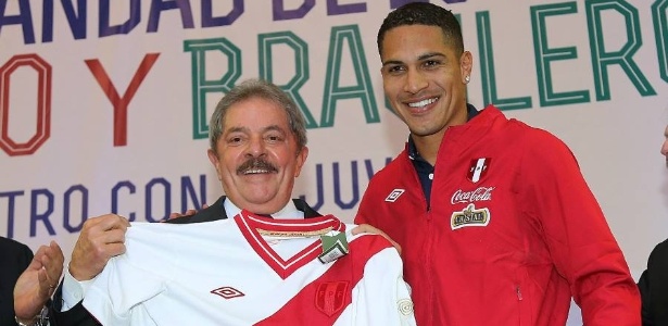 Lula no Peru, recebendo uma camisa do atacante corintiano Guerrero