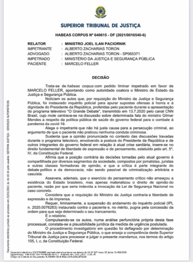 O STJ suspendeu, em janeiro, o interrogatório dele em inquérito policial solicitado pelo ministro da Justiça, André Mendonça.