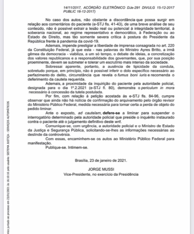 Mussi considerou que, dos comentários de Feller, “não é possível extrair a lesão real ou potencial à integridade territorial, à soberania nacional, ao regime representativo e democrático, à Federação ou ao Estado de Direito, mas tão somente severa crítica à postura do Presidente da República frente à pandemia da covid-19”