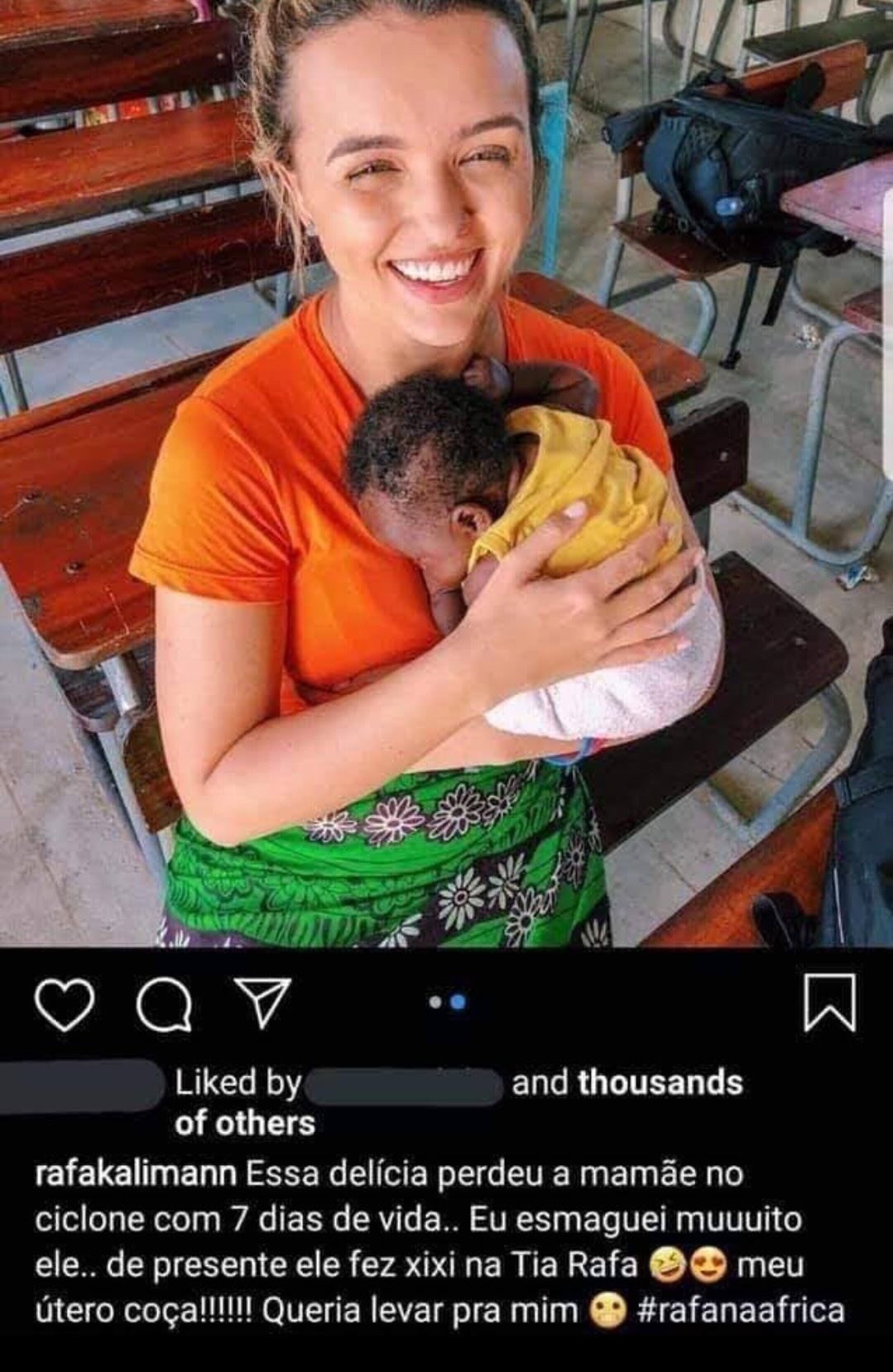 Viralizou no X uma foto de Rafa Kalimann (ex-BBB e influencer que pensa que é artista) com uma criança africana e a seguinte legenda: “Essa delícia perdeu a mamãe num ciclone com 7 dias de vida. Eu esmaguei muuuuito ele! De presente ele fez xixi na Tia Rafa”.