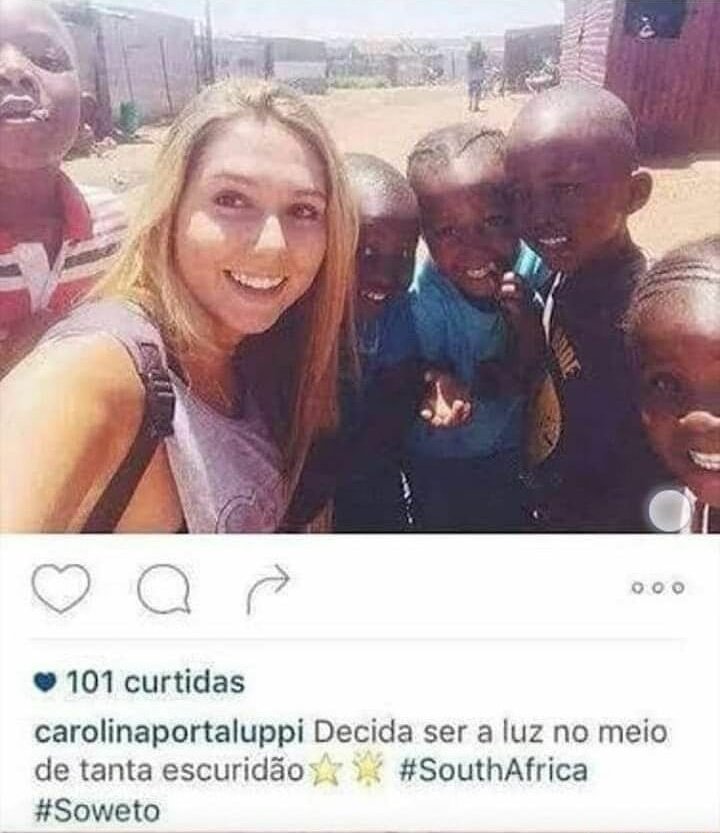Essa mulher, aliás, usa crianças negras como troféus para ganhar popularidade e posar de altruísta nas redes sociais há muito tempo. No Instagram, apareceu com outro bebê em Moçambique — ela supostamente trabalha para uma ONG — e escreveu a seguinte legenda: “Ser ponte exige escolha. Ser útil no amor. Do que você tem se alimentado?”