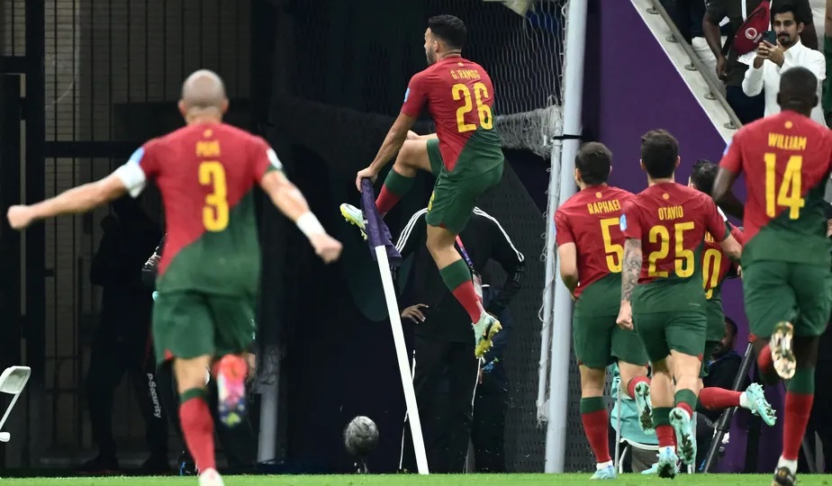 Jogadores de Portugal comemoram gol contra a Suíça