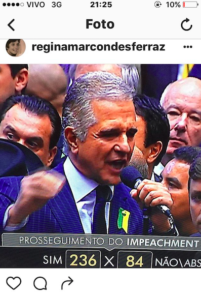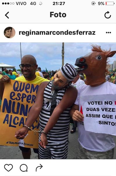 Regina, nos últimos anos, tornou-se uma ferrenha militante anti corrupção e pró-impeachment. Nas redes sociais, brindou os amigos do society com as montagens mais toscas da praça.
