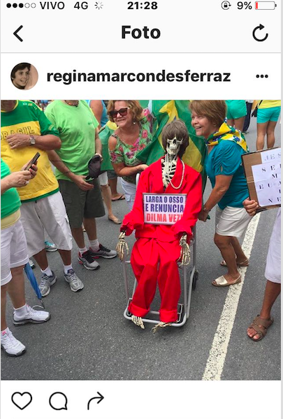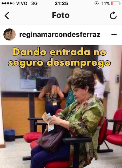 Uma das fotos de seu Instagram era de uma senhora parecida com Dilma, sentada melancolicamente em alguma repartição pública, e a seguinte legenda: “Dando entrada no salário desemprego”.