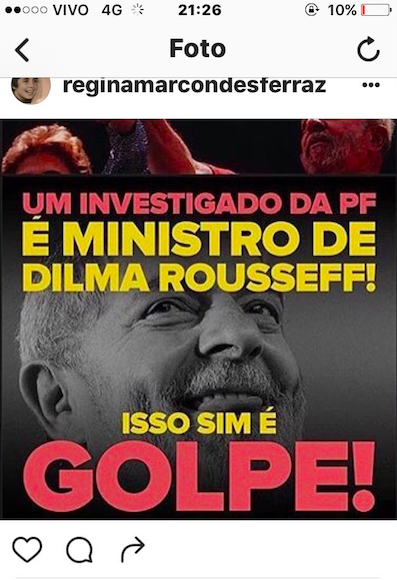 Outra tem a imagem de Lula sob a inscrição “um investigado da PF é ministro de Dilma Rousseff! Isso sim é golpe”. Só não bateu panela porque não sabe onde elas ficam.