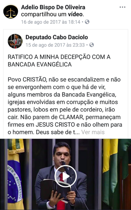Critica Alexandre Frota, Alckmin, Michel Temer, Deltan Dalagnol. Condena quem afronta a fé cristã. Enfim, é um caldo ultra variado.