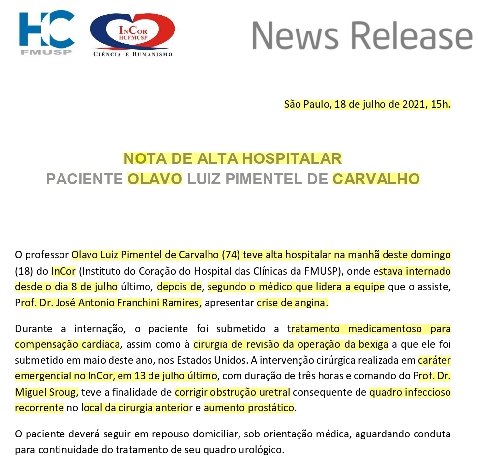 Em 18 de julho, após dez dias internado, Olavo teve alta hospitalar.