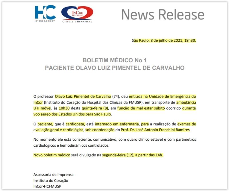 8 de julho, 18h30. O InCor, em nota à imprensa, informa que Olavo que “deu entrada na Unidade de Emergência, em ambulância UTI móvel, às 10h30, devido mal estar súbito ocorrido durante voo”.