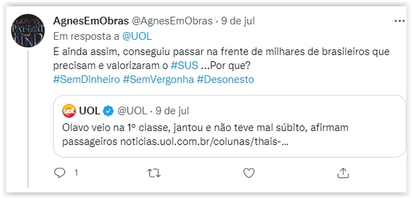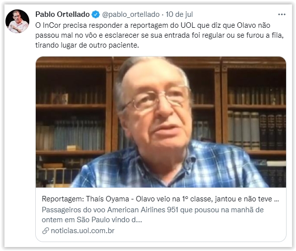 Reportagem de Thais Oyama, do UOL, contesta o comunicado do InCor de 8 de julho: Olavo veio na 1ª classe, jantou e não teve mal súbito, afirmam passageiros.