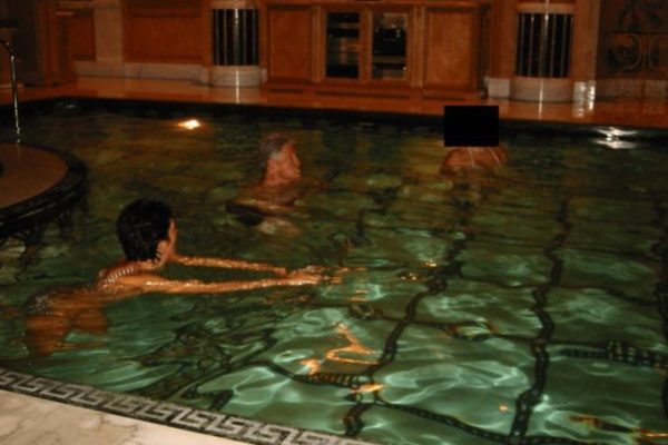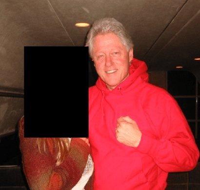 Em outra foto, Clinton aparece nadando com Ghislaine Maxwell em uma piscina, ao lado de uma pessoa com o rosto borrado. Em outras imagens, o ex-presidente surge acompanhado de diferentes pessoas, também com os rostos borrados.