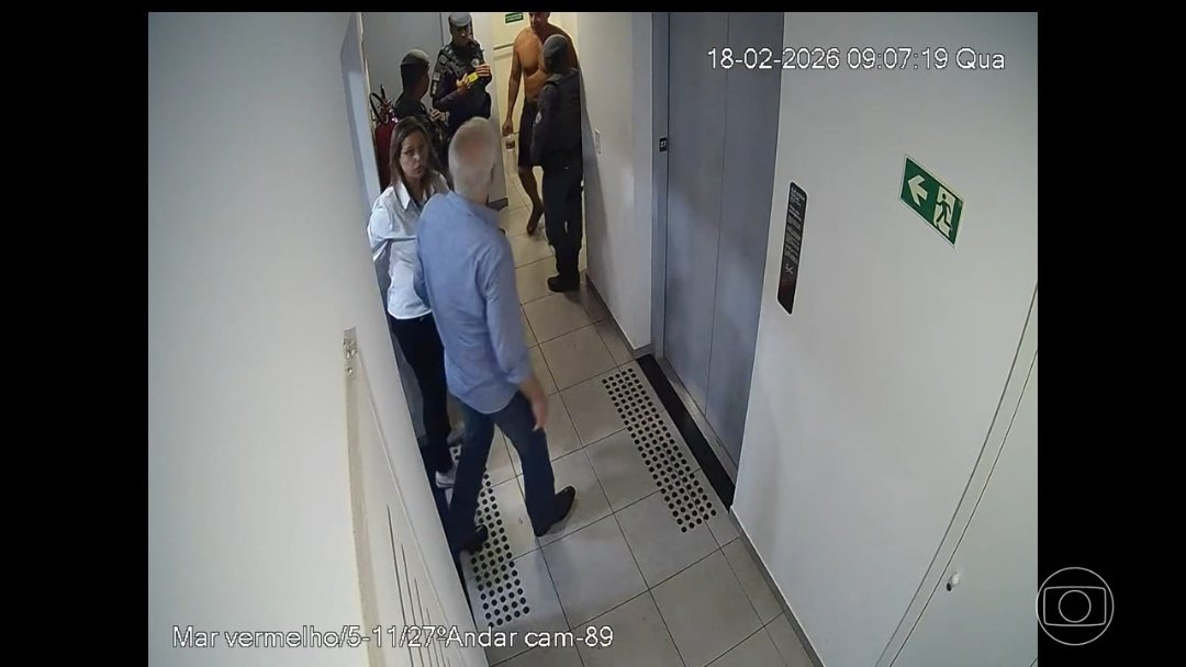 Às 9h07, o desembargador saiu de um elevador, atravessou uma área já isolada e foi direto ao encontro do oficial. Poucos segundos depois, ambos seguiram juntos até o apartamento onde a vítima havia sido encontrada.