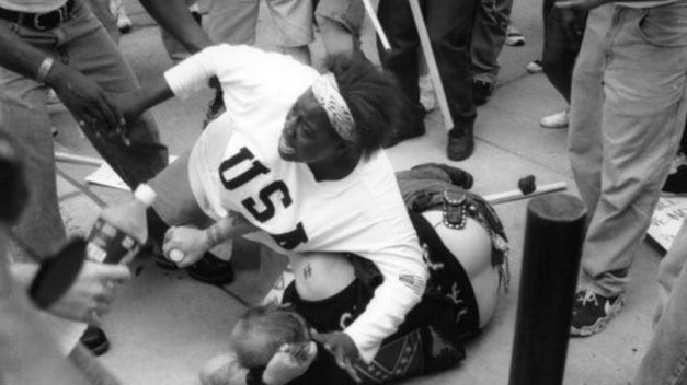 Cerca de 300 militantes anti-KKK foram protestar contra a marcha. Entre eles estava Keshia. O grupo empunhava cartazes e gritava para os mascarados da Klan, quando alguém avistou na multidão um homem com uma camisa com o emblema dos Confederados e um SS tatuado no braço.