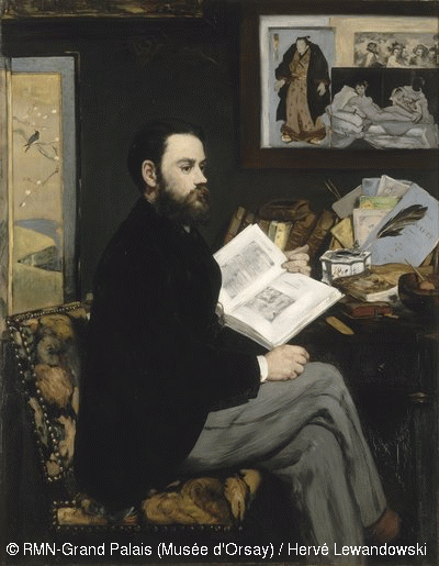 Presto atenção nos detalhes. Na parede do cômodo em que Zola foi pintado está Olímpia, sob os olhos de uma mucama com uma corbelha nas mãos, em sua nudez perfeita que escandalizou a França nos primeiros tempos do impressionismo.