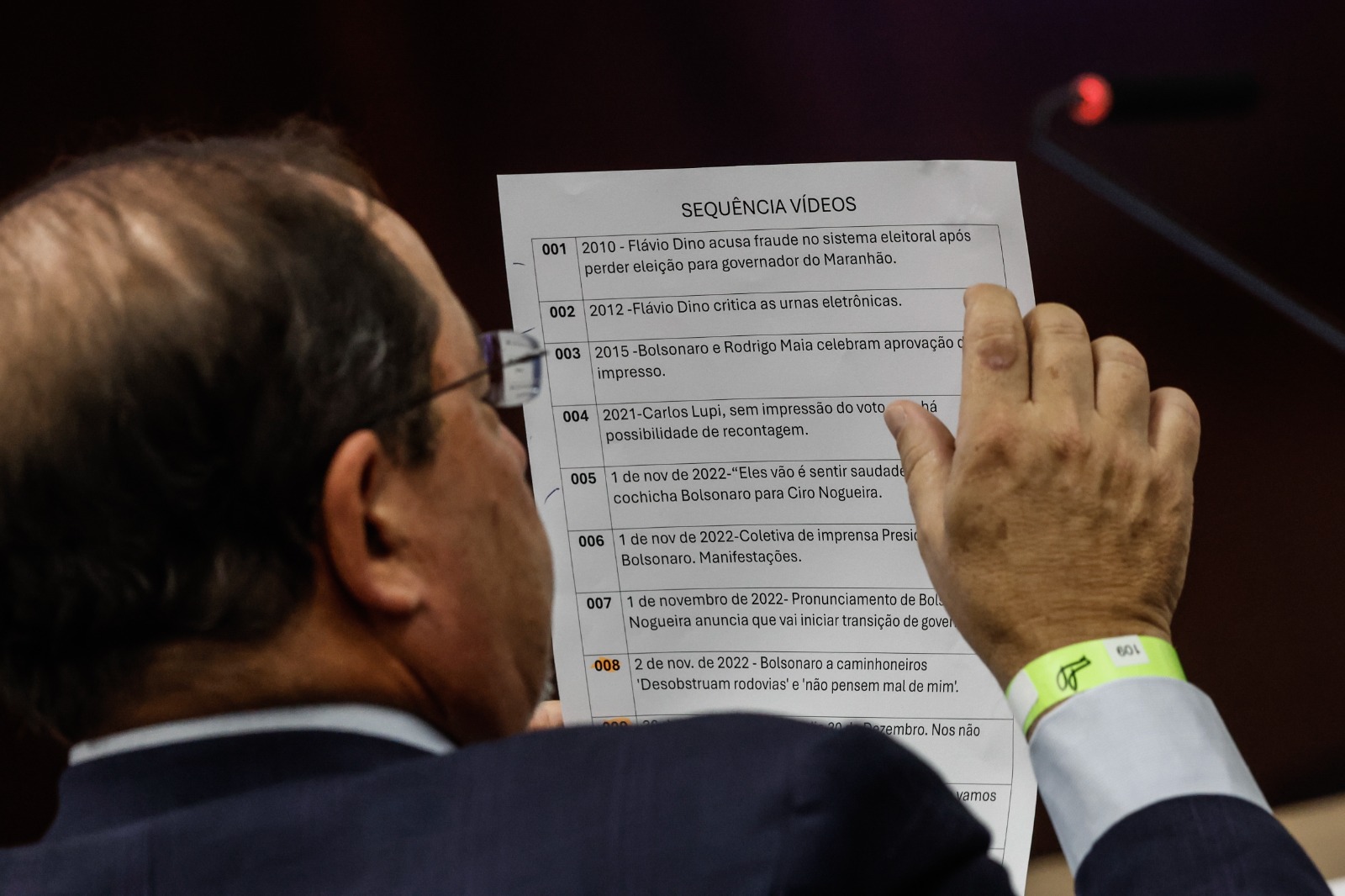 Nas anotações levadas pelo advogado Celso Vilardi, intituladas “Sequência de Vídeos”, constam referências a pronunciamentos de Dino criticando as urnas eletrônicas quando era governador do Maranhão.
