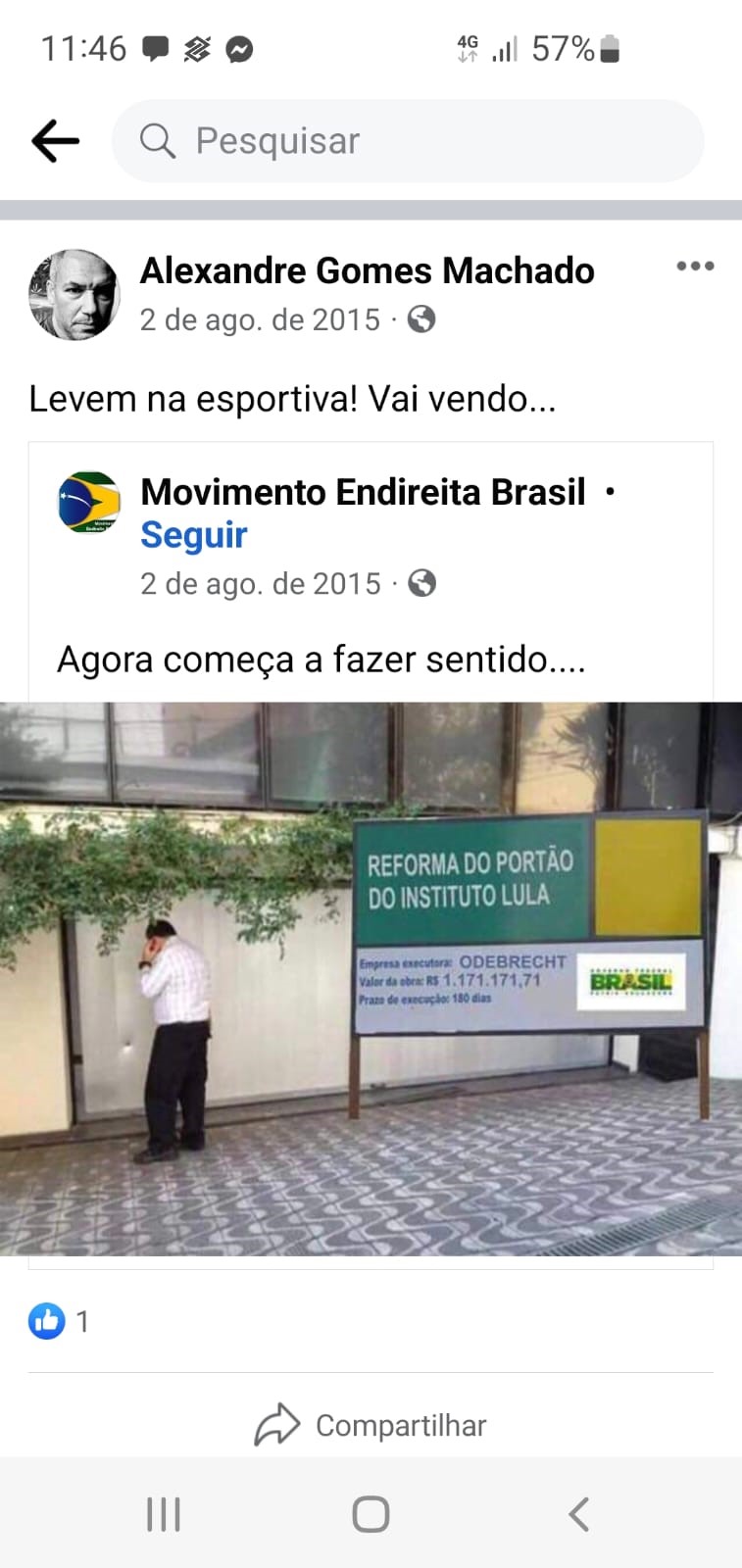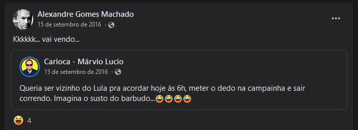 Ele também compartilhou provocação de um humorista que dizia ter vontade de ser vizinho de Lula para aplicar um susto no petista tocando a campanha dele pela manhã. O post é de 2016, quando o ex-presidente foi alvo de condução coercitiva da Lava Jato.